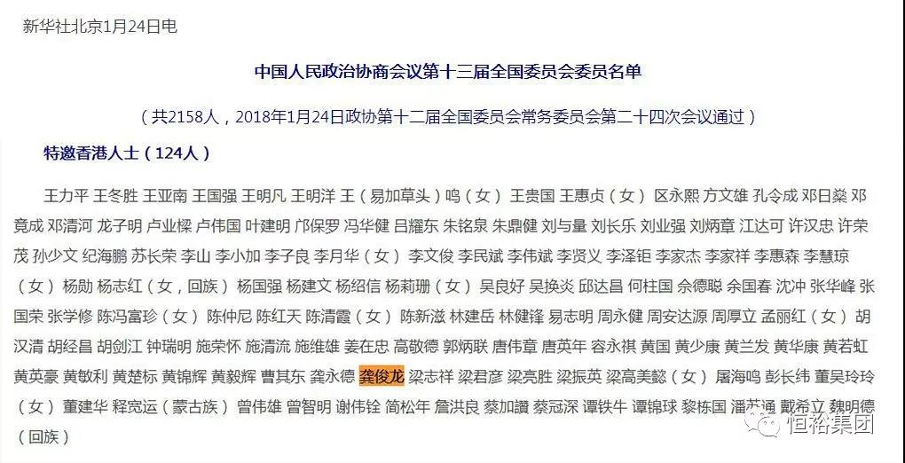 经2018年1月24日政协第十二届全国委员会常务委员会第二十四次会议通过,中国人民政治协商会议第十三届全国委员会委员名单产生,恒裕集团董事局主席龚俊龙当选全国政协委员。