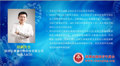 胡鹏董事长从公司定位、公司概况、框架体系、产品体系、产品研发等方面介绍弘睿康公司。据介绍,弘睿康是中国人体菌群(微生态)健康研究与管理专家,聚焦疾病精准防治需求,运用菌群基因测序+大数据+AI技术,针对健康/高风险、疾病人群以相关领域的研究者提供以肠道菌群为对象的精准诊断服务和临床科研解决方案,进而促进实现有效的精准的保健和疾病治愈,依托专业、高效、高服务质量的检测和分析平台以及强大的研发能力,探索与改善生命质量,让人的生命更具天然活力。