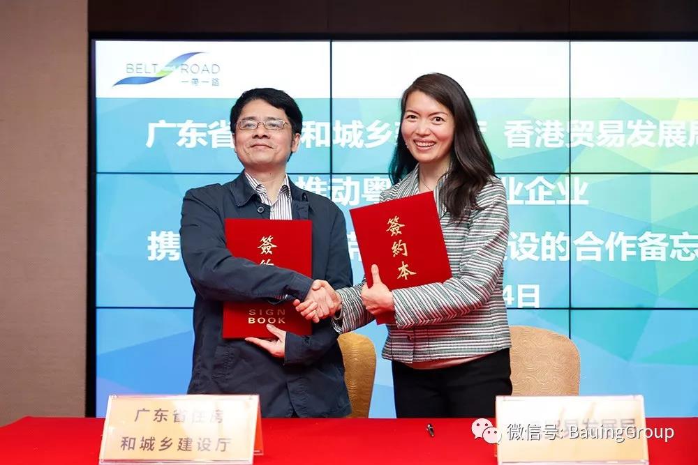 ▲广东省住房和城乡建设厅党组成员、副厅长蔡瀛与香港贸易发展局华南首席代表吴文慧作为粤港双方代表签署《推动粤港建筑业企业携手参与“一带一路”建设的合作备忘录》