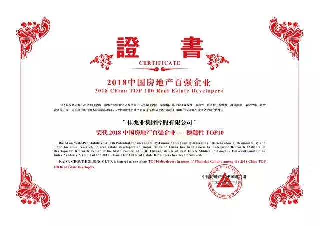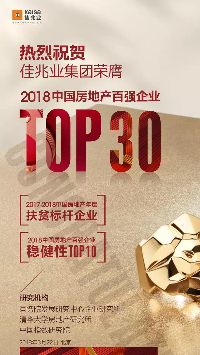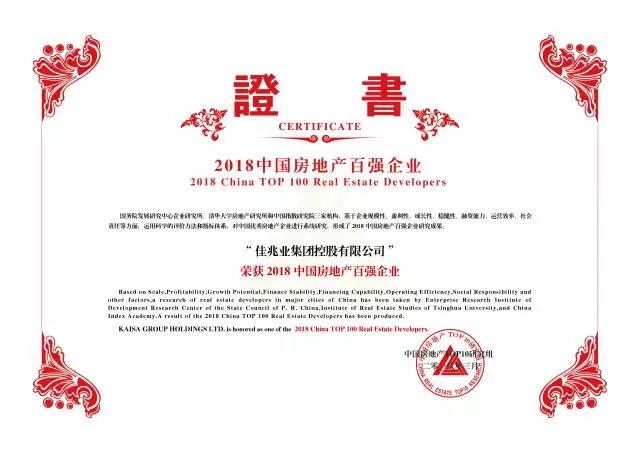 再获权威机构肯定 佳兆业位列「2018中国房地产百强企业」第30名