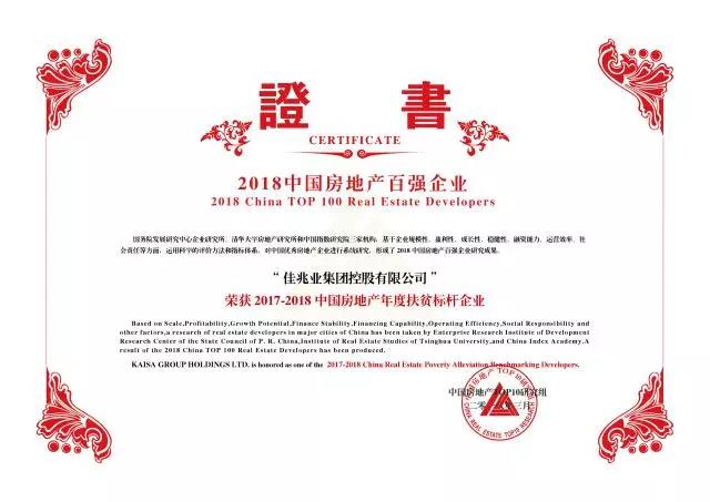 3月22日, “2018中国房地产百强企业研究成果发布会”和“第十五届中国房地产百强企业家峰会”在北京钓鱼台国宾馆隆重召开。凭借良好的经营业绩和强劲的综合实力,佳兆业集团获评“2018中国房地产百强企业30强”、 “2018中国房地产百强企业——稳健性TOP10”。此外,由于在公益慈善方面的突出贡献,佳兆业集团还被评为 “2017-2018中国房地产年度扶贫标杆企业”。