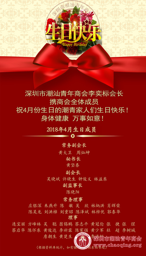 2018年4月22日,深圳市潮汕青年商会在福田区文化创意园H馆2层文化长城集团(股票代码:300089)举办生日晚会,为4月份生日的潮青商会成员送上美好的生日祝福。