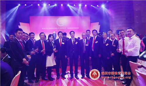 深圳市潮汕商会会长吴木棠(中)、深港揭西商会会长林少华(右六)、深圳市中小企业投融资商会首任决策委员会主席王长利(右五)、李奕标会长(左七)与潮青商会代表团合影