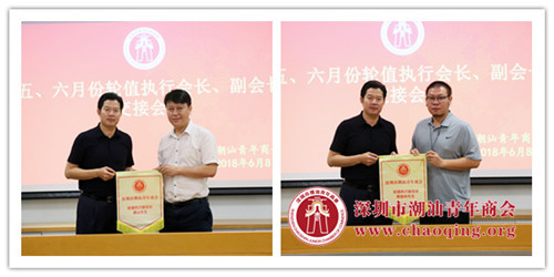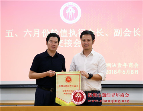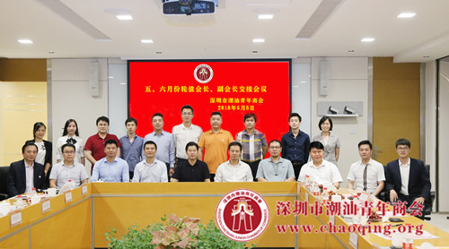 2018年6月8日下午,深圳市潮汕青年商会5、6月份轮值会长、副会长交接会议在海岸城召开。会议汇报了5月份商会工作开展情况,汇报了6月份轮值工作计划。与会成员就如何创新高效开展轮值工作进行热烈讨论,提出许多可行性建议。李奕标会长做总结式发言,并为6月份轮值班子成员授旗。