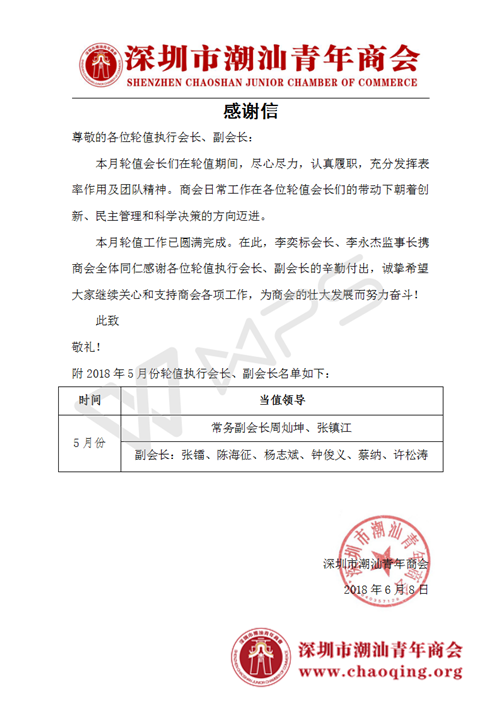 5月份轮值会长张镇江在工作总结中提到,商会5月份共完成23项工作,主要包括拜访百年老店商会、走进品牌潮商企业学习、参加社团活动、拜访各行业潮青精英等内容,总体成效不错,亮点突出,组团学习成为常规化。他说,近几次学习活动得到商会成员的热烈反响,期待未来在更深层次、更宽领域开展潮青特色品牌活动,持续推进打造学习型青年社团。