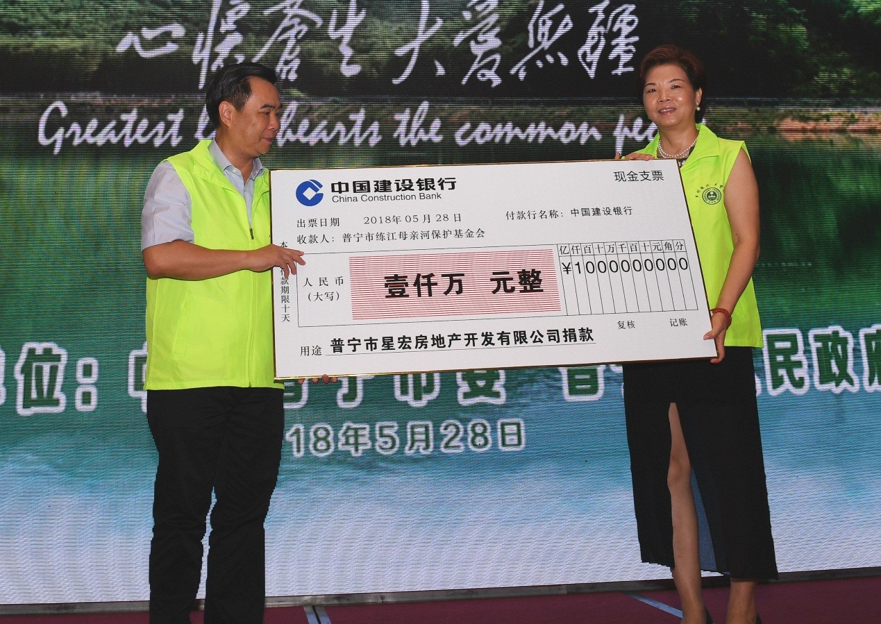 2018年5月28日上午,以“乡村振兴、乡贤给力”为主题,由广东省普宁市人民政府倡议发起的普宁市练江母亲河保护基金会成立大会在普宁市举行。星河控股集团向该基金会捐款人民币1000万元,用于练江流域生态保护。星河控股集团总裁姚惠琼代表公司向基金会捐款,董事长黄楚龙、地产集团东部区域总裁朱家雄、地产集团普宁公司总经理骆仕平,以及星河合作伙伴广东南方梅园生态村有限公司董事长许纯杰共同见证了这一重要时刻。