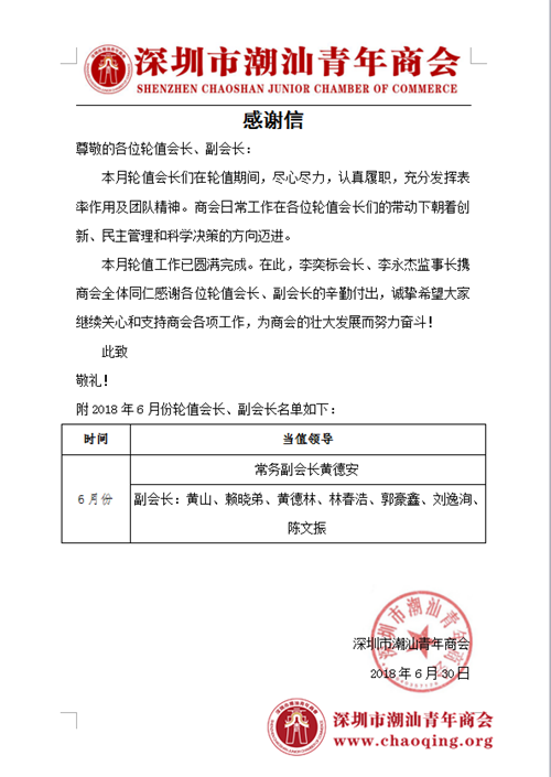 黄德安轮值会长表示,这一个月的轮值工作,既是考验自身和轮值班子组织领导能力的过程,也是与潮青兄弟姐妹增进了解、加深友谊的过程。既有挑战,也获益匪浅。商会让我们更深切体会到平台对个人和企业成长发展的作用,体会到合作的重要性。
