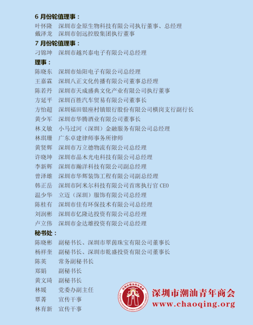 2018年7月份轮值会长为佘宋嘉;轮值副会长为胡俊波、许杰鑫、魏子群、张浩铭、李世亮。