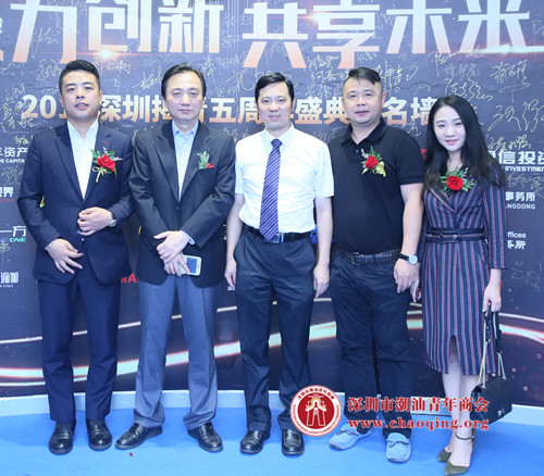 黄坚泰秘书长(右三)与共青团揭阳市委副书记陈颖聪(中)、深圳揭商青联主席郑子章(右四)合影