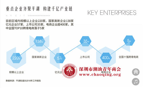 目前区域内规模以上企业220家,国家高新企业138家,亿元企业57家,上市公司35家,电商企业超400家,其中全国TOP10跨境电商落户5家(数据来源:平湖街道办2018年工作报告)