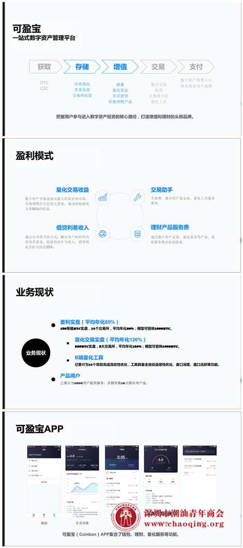 项目介绍:可盈宝是基于区块链技术的下一代数字资产管理产品,旨在为用户提供数字资产管理能力,协助用户进行数字资产增值。可盈宝推出多样化的产品组合,包括储币、生币、币币借贷、理币产品等。