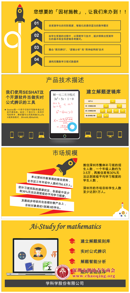 项目介绍:以人工智能(AI)的发展基础,建构完整数学方程式数据库,整合“图形辨识”、“逻辑分析” 和“类神经网络”技术。可由学生受测的过程中,以深度学习技术,逐步探索出受测学生的基本观念和逻辑思考模式,达到评量题目可依学生程度进行智能匹配的因材施教。