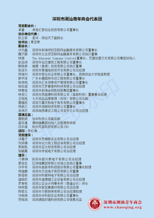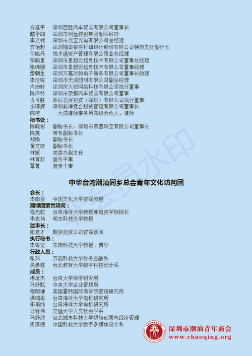 中华台湾潮汕同乡总会会长李南贤特于7月份组织参访团,成员包括台湾知名大学的教授学者,知名企业代表、在台潮籍青年学子,和优秀青年创业团队。造访广州、深圳等地的创业中心,并与深圳、香港、加拿大等潮商社团进行深入交流与专题座谈,计划串起“潮创”产业链,搭建台湾青年与潮籍青年携手合作的舞台。