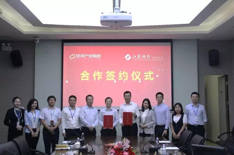 2018年7月25日上午,江苏银行深圳分行与星河产业集团在星河•领创天下签订江苏银行党费收费系统合作协议。江苏银行深圳分行副行于幼杰、投行业务发展部总经理王茜、小企业信贷服务中心副总经理游如飞,星河产业集团常务副总裁陈忠、星河金融集团副总裁周为、星河产业集团人力行政总监张长宏、星河学院副总监罗福映等相关领导参加了签约仪式。