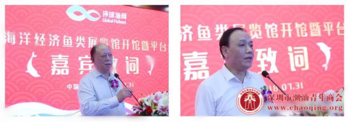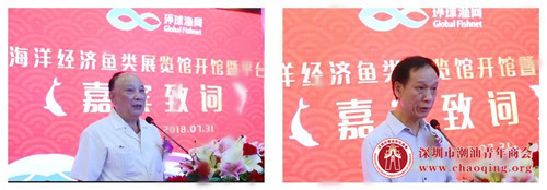 本会永远荣誉会长、深圳市潮汕商会创会会长吴开松,广东省水产协会会长周辉,本会荣誉会长、加拿大潮商总会会长林少毅,农业部中国渔业协会秘书长兼常务副会长林毅分别致辞,对环球渔网海洋经济鱼类展览馆顺利开馆及平台隆重启动表示祝贺。