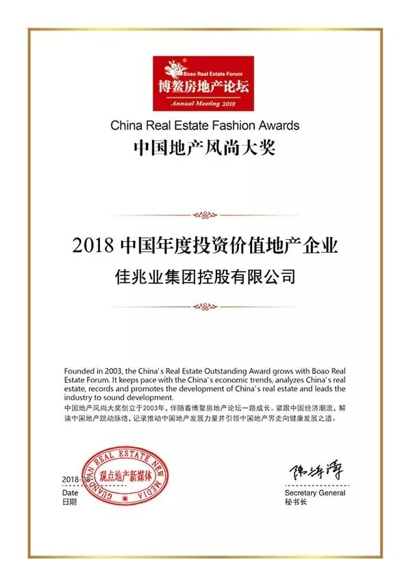 此次获评“中国地产风尚大奖——2018中国年度投资价值地产企业”,显示了市场机构对佳兆业的肯定,意味着公司依托前瞻性战略布局、深耕粤港澳大湾区、大量优质低价土储资源等多重优势,进一步巩固了消费者、资本市场对集团良性稳健发展的预期,为公司未来可持续发展提供强劲支撑。