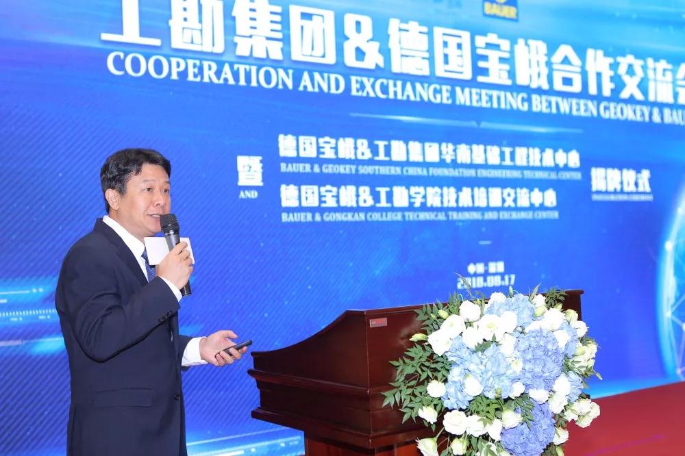 工勘集团董事长雷斌在会上对公司的岩土工程施工新技术进行了宣读,重点介绍了在灌注桩施工方面所取得的创新成果。雷总表示,工勘集团一直以来注重技术创新与科研开发,拥有一大批自主知识产权的发明、专利和工法,推动了行业技术水平的提升;期待通过宝峨先进的机械设备为我们提供更高效、安全、可靠的施工方案,通过中德双方深入的分享交流和实践,研究、攻克在实际工程中遇到的各种技术难题,研发出更多、更适用的新工艺,制造出更先进、高效的施工机械。雷总提到,多年来公司得到众多行业专家的指导和帮助,希望继续加强行业合作交流,共同推动岩土事业的发展。