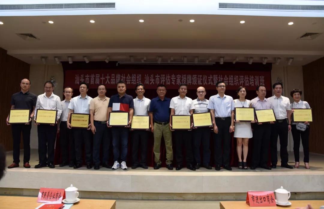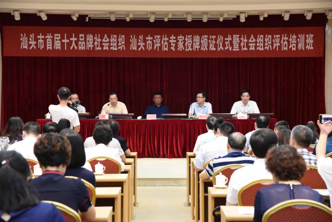 2018年8月16日,汕头市首届十大品牌社会组织、汕头市评估专家授牌颁证仪式暨社会组织等级评估培训班在汕头市迎宾馆隆重举行!会上颁发了汕头市社会组织十大品牌,十大“领军人物”,十大优秀秘书长、主任的荣誉牌匾,以及汕头市第三方社会组织等级评估专家库专家聘书。