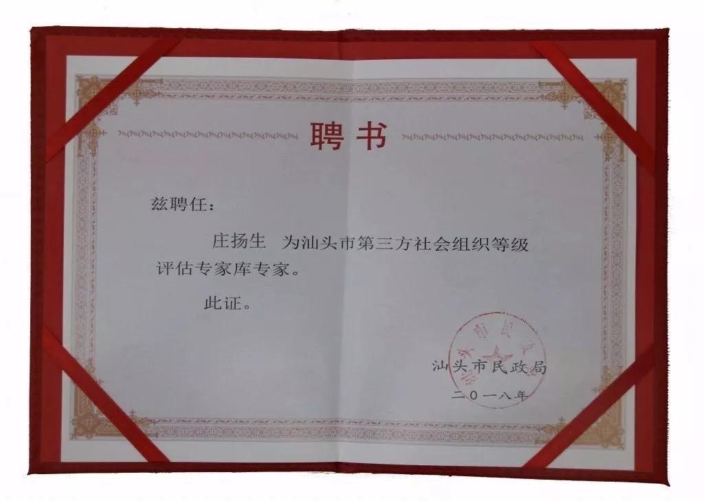 ▲ 汕头市第三方社会组织等级评估专家库专家聘书