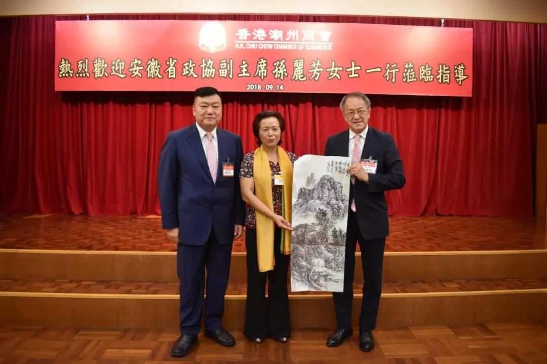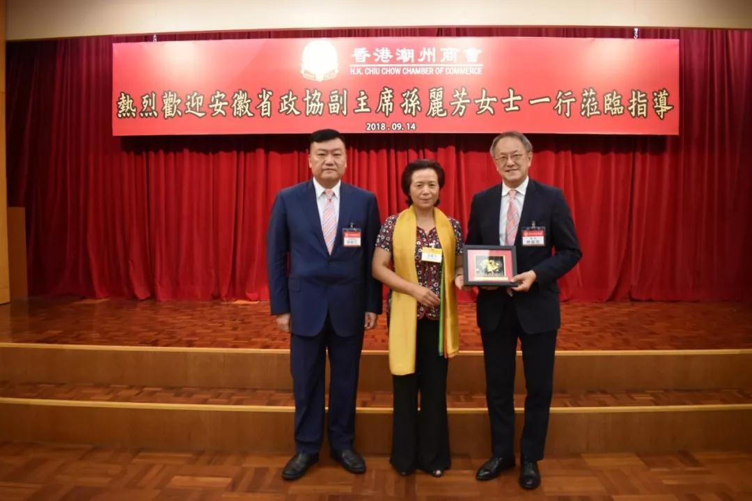 安徽省政协副主席孙丽芳表示,今次到访香港潮州商会,不仅是探望安徽省推选的全国政协委员——胡剑江永远荣誉会长,亦是来商会同林宣亮会长等新朋友交流学习的。今次到访香港潮州商会,收获很多。她又表示,安徽省近年来参与长江经济带建设,重视发展创新科技产业,在基础设施建设方面投入很多,交通的便利令区位优势更加凸显。本会和安徽省去年签署「合肥侨梦苑合作协议」,让双方关系更上一个新的台阶。她希望双方继续加强合作,优势互补,亦欢迎本会首长到访安徽,考察学习,寻找商机,共同促进两地的繁荣进步。她亦衷心祝愿本会和安徽省未来的合作愉快。
