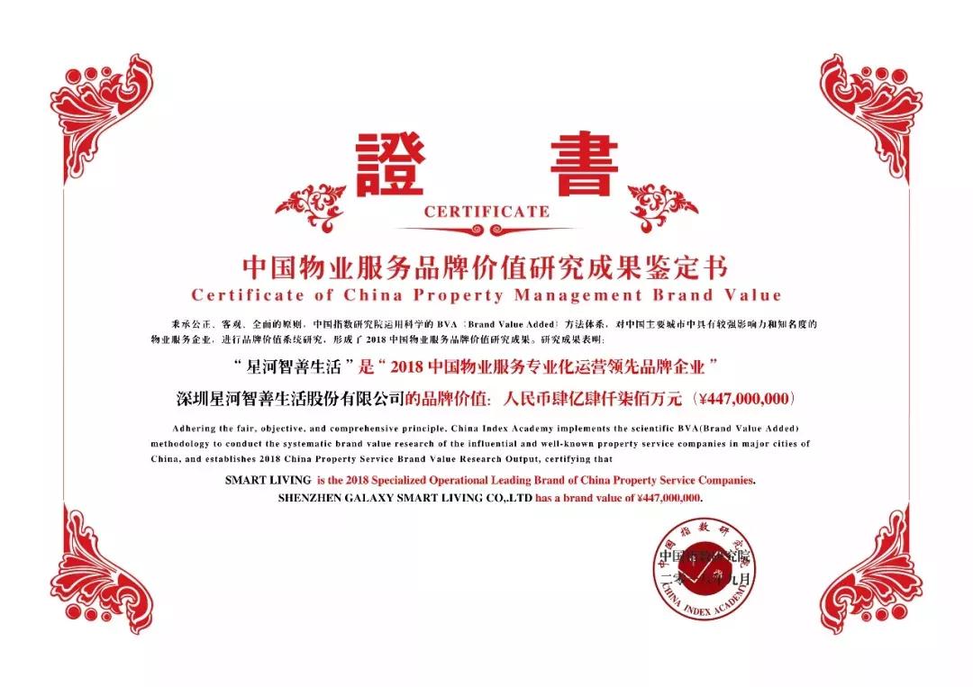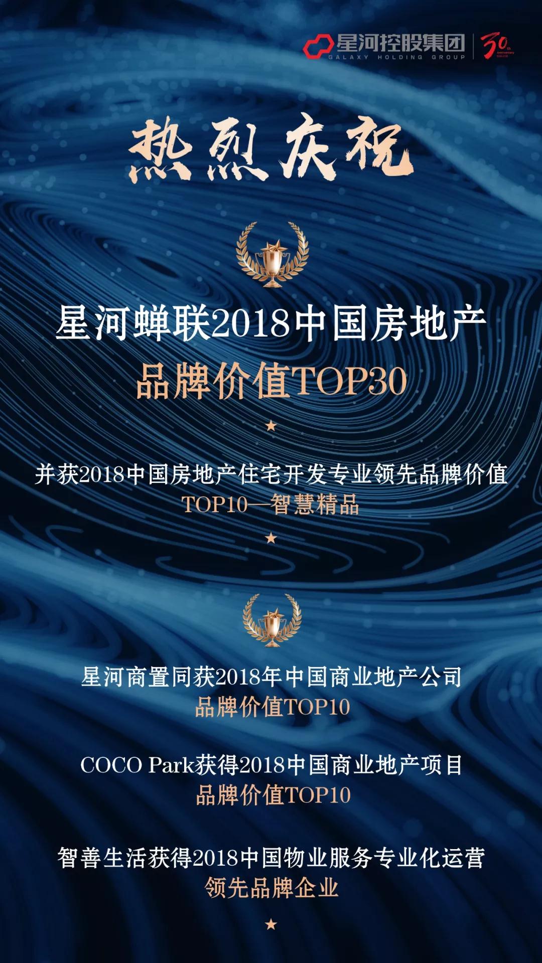 凭借优异城市运营经验、产品创新和多领域整合能力,星河蝉联“2018中国房地产公司品牌价值TOP 30”, 并获评“2018中国房地产住宅开发专业领先品牌价值TOP10—智慧精品”的荣誉称号。品牌价值由2017年的61.7亿元上升至今年的74.4亿元,同比上升20.57%。