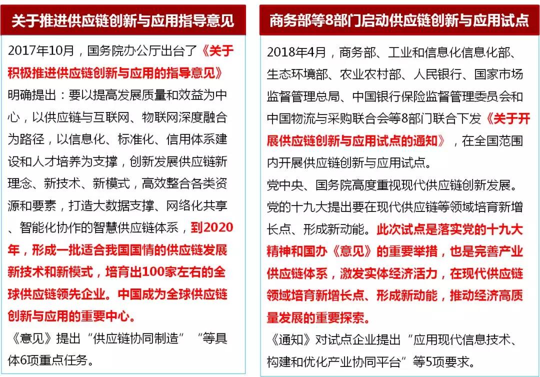 2017年10月,国务院出台了《关于积极推进供应链创新与应用指导意见》(简称“意见”),为现代供应链的发展指明了方向和任务要求。发展现代供应链成为推进深化供给侧结构改革、建设创新型国家的重要组成部分,是国家的战略要求。此次试点工作对《意见》的具体落实,是完善产业供应链体系,激发实体经济活力,在现代供应链领域培育新增长点、形成新动能的重要探索。