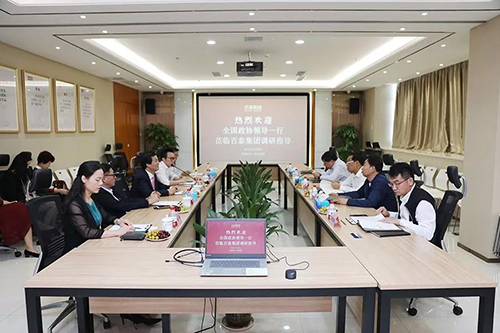考察中,双方首先进行了亲切、深入的座谈交流。百泰集团董事长周灿坤首先就企业的发展历史、规模、成绩、规划以及企业文化、人才建设等方面的基本情况向到访领导进行了简要介绍,并恳请刘晓峰副主席提出改进意见,以便企业更好发展。