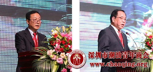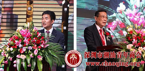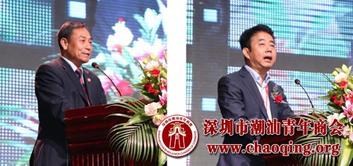 汕头市澄海区政协主席陈训然(左)深圳市汕头澄海商会会长朱英顺(右)致辞