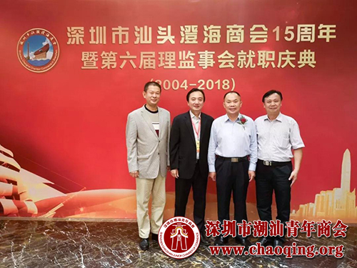 2018年10月27日,深圳市汕头澄海商会十五周年庆典暨第六届理监事会就职典礼在深圳市龙岗宝亨达国际大酒店隆重举行。澄海区政协主席陈训然,区委常委统战部部长林典发,澄海区政协副主席、工商联主席许松辉,广东省政协常委、香港特区太平绅士MH吴哲歆,深圳市汕头澄海商会创会会长蔡贤慈,第二、第四届会长潘坤永,第三届会长许少汕,会长朱英顺等领导、会长、海内外及深圳潮属社团会长和代表、澄海商会全体会员等约700多人出席盛会,共同见证了这一激动人心的历史一刻。深圳市潮汕青年商会秘书长黄坚泰,监事潘俊鸿,常务副秘书长陈英等应邀参加大会。