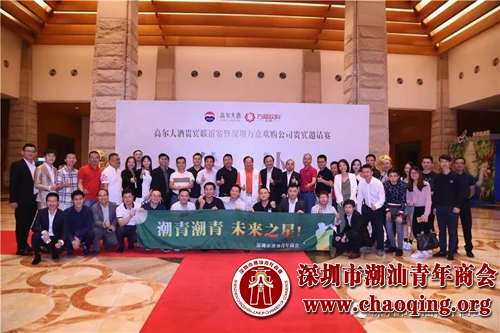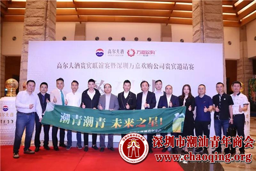 潮商联盟高尔夫球会会长、深圳万嘉欢购电子商务有限公司詹福忠董事长(左七)与本会成员共同为活动点赞