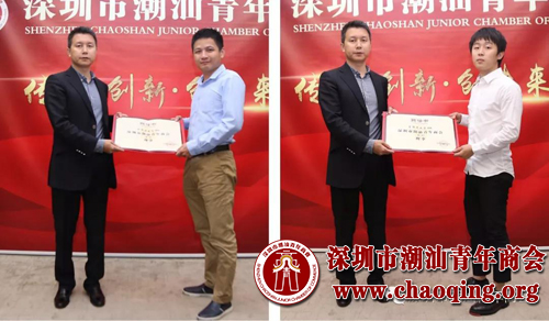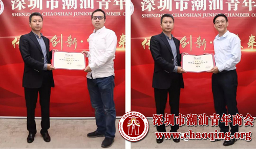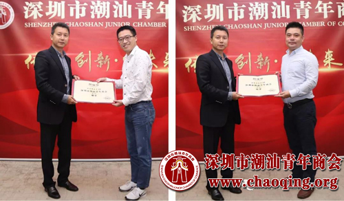 轮值会长黄大卫(左)为常务理事林龙涛(右)颁发聘书