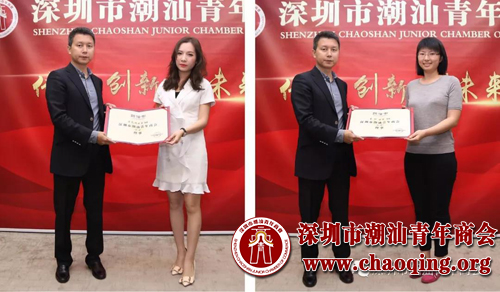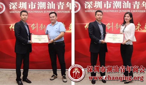 轮值会长黄大卫为理事陈凯煌(左)、黄珊(右)颁发聘书