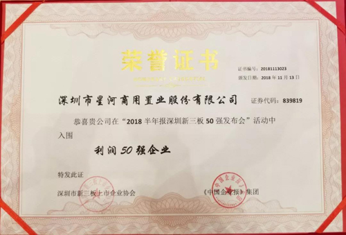 2018年11月13日,由深圳市新三板上市企业协会和《中国企业报》集团联合举办的“2018半年报深圳新三板50强发布会”在深圳五洲宾馆召开。凭借强大的综合实力及良好的经济收益,星河商置荣获“2018半年报深圳新三板利润50强”殊荣。