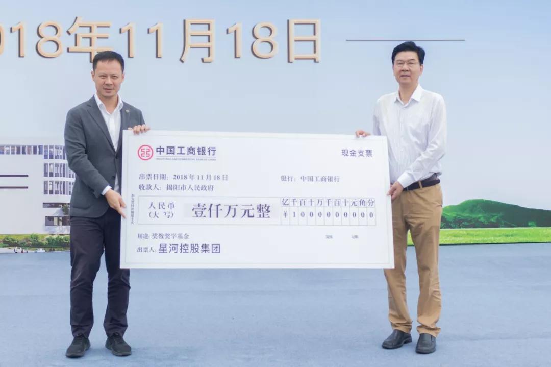 星河控股集团董事常务副总裁黄德安(左)代表星河控股集团向揭阳市政府捐赠奖教奖学基金1000万元