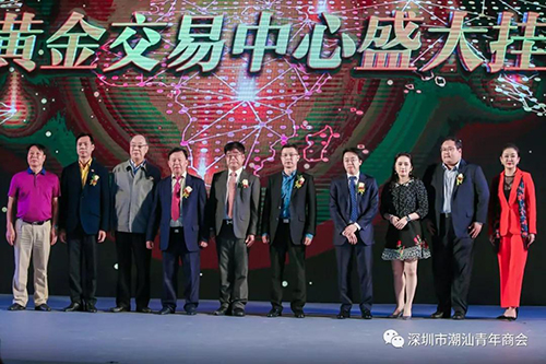 全国政协原常委、深圳市委原书记厉有为(左三),深圳市人大原代主任、深圳市商业联合会会长庄礼祥(左五),深圳市潮汕青年商会荣誉会长、大中华国际投资集团董事局主席黄世再(左四),深圳市潮汕青年商会常务副会长、大中华国际投资集团董事局副主席黄大卫(右五),全球黄金交易中心董事长黄大伟(右四)等合影