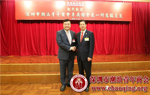 2018年5月16日,深圳市潮汕青年商会会长李奕标率代表团赴香港潮州商会拜访学习,受到香港潮州商会会长胡剑江(全国政协委员)、副会长林宣亮、高佩璇(全国政协委员)、常务会董陈捷贵、李焯麟、张俊勇(全国人大代表)、会董陈德宁、副秘书长詹培勋等热烈欢迎和热情接待。双方就抓住粤港澳大湾区发展机遇,增强两会互动往来,推动深港和粤港澳大湾区潮商交流合作进行了深入交流。