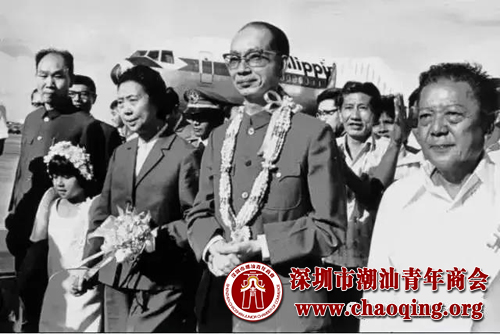 柯华夫妇(前排右二、右三)在机场接受菲律宾民众的热烈欢迎(1975年)
