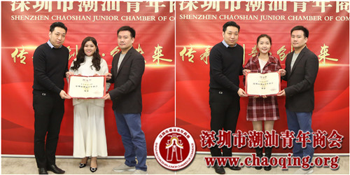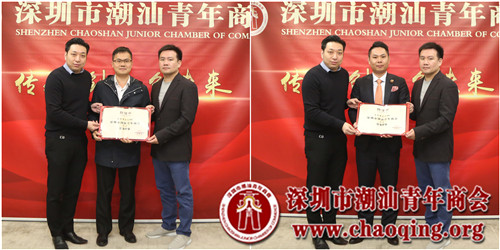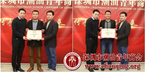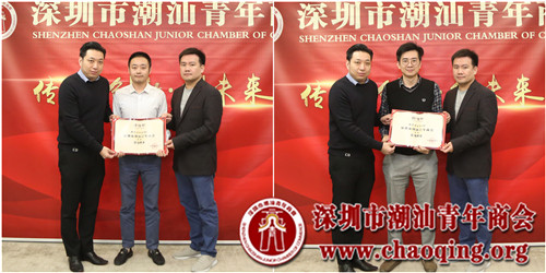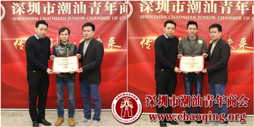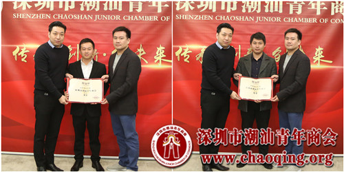 会上,受李奕标会长的委托,轮值会长吴泽锐、许晓生一起为新入会成员颁发聘任证书,并欢迎大家正式加入到潮青商会大家庭。