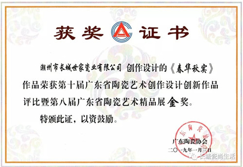 2018年12月29日,第十届广东省陶瓷艺术创作设计创新作品评选暨第八届广东省陶瓷艺术精品展、首届广东省少儿陶瓷艺术作品大赛在潮州市中国瓷都陈列馆拉开序幕。本次参展作品共有500多件,主要来自潮州、梅州、佛山、东莞、广州、江门、惠州、汕头、中山等地区。长城世家设计团队创作的《春华秋实》、《罗马假日》两套作品均获金奖。