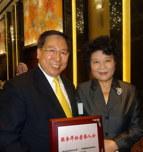 国务院侨办主任裘援平为建和谐侨社做出突出贡献的资深侨领庄佩源颁发“服务华社荣誉人士”荣誉证书。