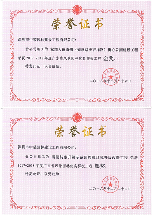 日前,2017-2018年度广东省风景园林优良样板工程奖揭晓,中装园林两个项目榜上有名,分别是清湖转型升级示范园周边环境升级改造工程(绿化)、龙翔大道南侧(如意路至吉祥路)街心公园建设工程,为中装园林优质样板工程荣誉簿再添新辉!