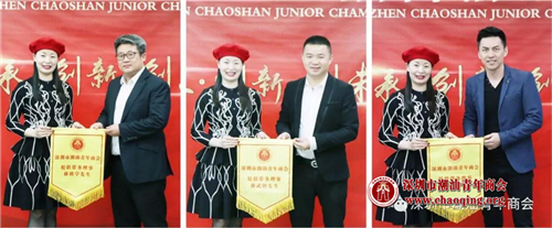 3月份轮值会长李奕庄为3月份轮值副会长黄泽霞(左)、周创(右)授旗