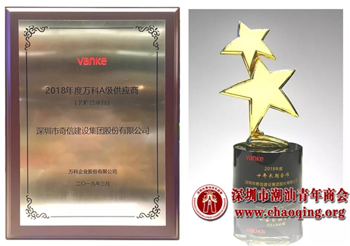 ▲奇信股份荣获万科“2018年度A级供应商”称号和十年长期合作奖