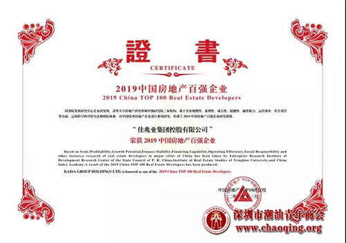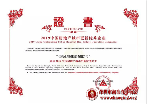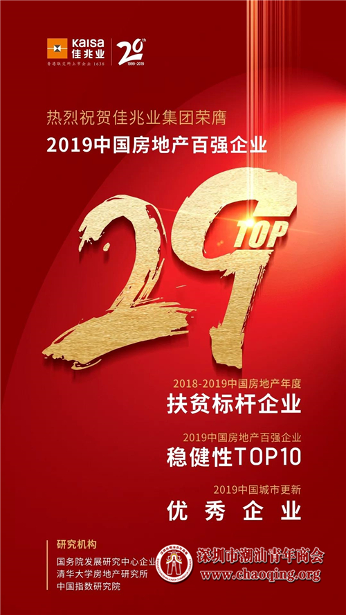 3月19日,“2019中国房地产百强企业研究成果发布会暨第十六届中国房地产百强企业家论坛”在北京举行。凭借良好的经营业绩和强劲的综合实力,佳兆业集团获评“2019中国房地产百强企业29强”、“2019中国房地产百强企业——稳健性TOP10”、“2018-2019中国房地产年度扶贫标杆企业”。此外,由于在城市更新方面的领先优势及突出表现,佳兆业集团还被评为“2019中国城市更新优秀企业”。