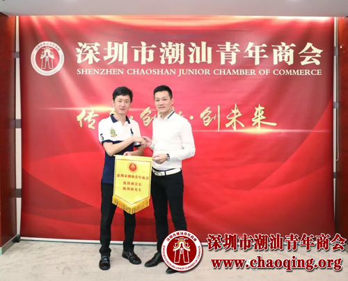 4月份轮值会长吴怡德(左)为4月份轮值常务理事詹朝明(右)授旗