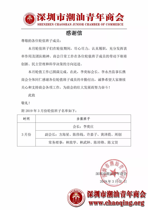 3月份轮值会长李奕庄表示,非常感谢商会轮值班子、会员兄弟姐妹以及秘书处的共同协作,使得商会各项工作有条不紊地进行。希望4月轮值班子加强与秘书处沟通合作,周密部署,高效工作,把3月还未完成的工作继续推进落实,完成好4月份各项工作。她表示,潮青商会从几十人发展到800多人,社会影响力不断提高,这是全体会员和秘书处同心同德共同努力的结果。大家要以高度的责任感和使命感做好商会轮值工作,尽最大的努力,共同擦亮潮青商会品牌,为新一代的潮青们创造更好的发展平台。