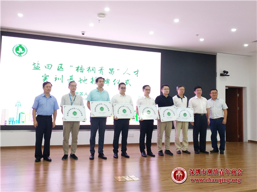 盐田区委常委、区委组织部部长袁虎勇(右二),盐田区副区长乔宏彬(左一),盐田区人力资源局局长谢向东(右一)为百泰集团等优秀企业颁发“梧桐青苗人才实训基地”牌匾