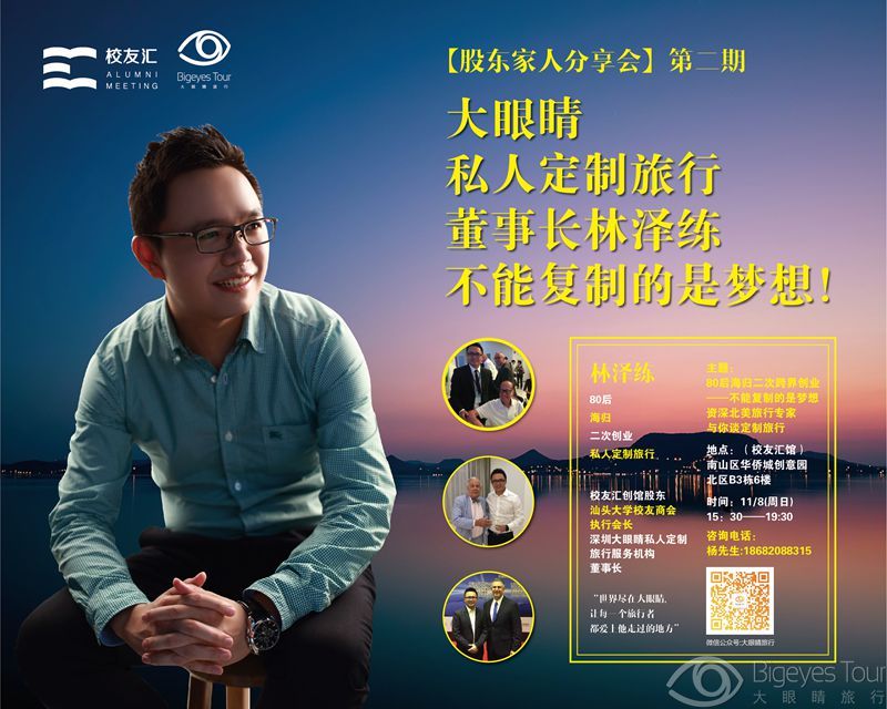 11月8日,大眼睛旅行第二期分享会——“不能复制的是梦想”在南山华侨城创意园隆重举行。校友汇馆品牌创始人柯旭东先生、桂林旅游学院深圳校友会会长杨枝女士、重庆大学深圳校友会常务副会长包学平先生、柯桥天虹总经理杨阳先生、侨城泳协会长李惠强、世界生态文化协会秘书长张铁军、南华大学校友会秘书长谢军先生 、中南民族大学名誉会长刘俐女士等近80位来自各行业的领军人物汇聚一堂,共享梦想课。