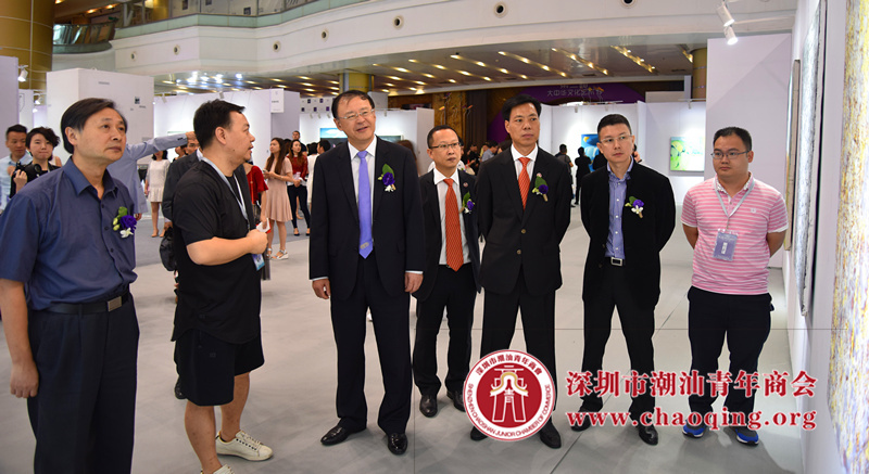 深圳市侨联主席、深圳市侨办负责人马勇智,深圳市潮汕青年商会常务副会长、大中华国际集团董事会副主席黄大卫,深圳润德有限公司董事局主席吴木棠欣赏参展作品