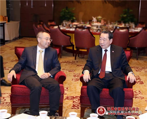正大集团资深董事长谢国民(右)与全国工商联原党组副书记、原专职副主席、潮商东盟投资基金筹备组组长黄小祥(左)交流